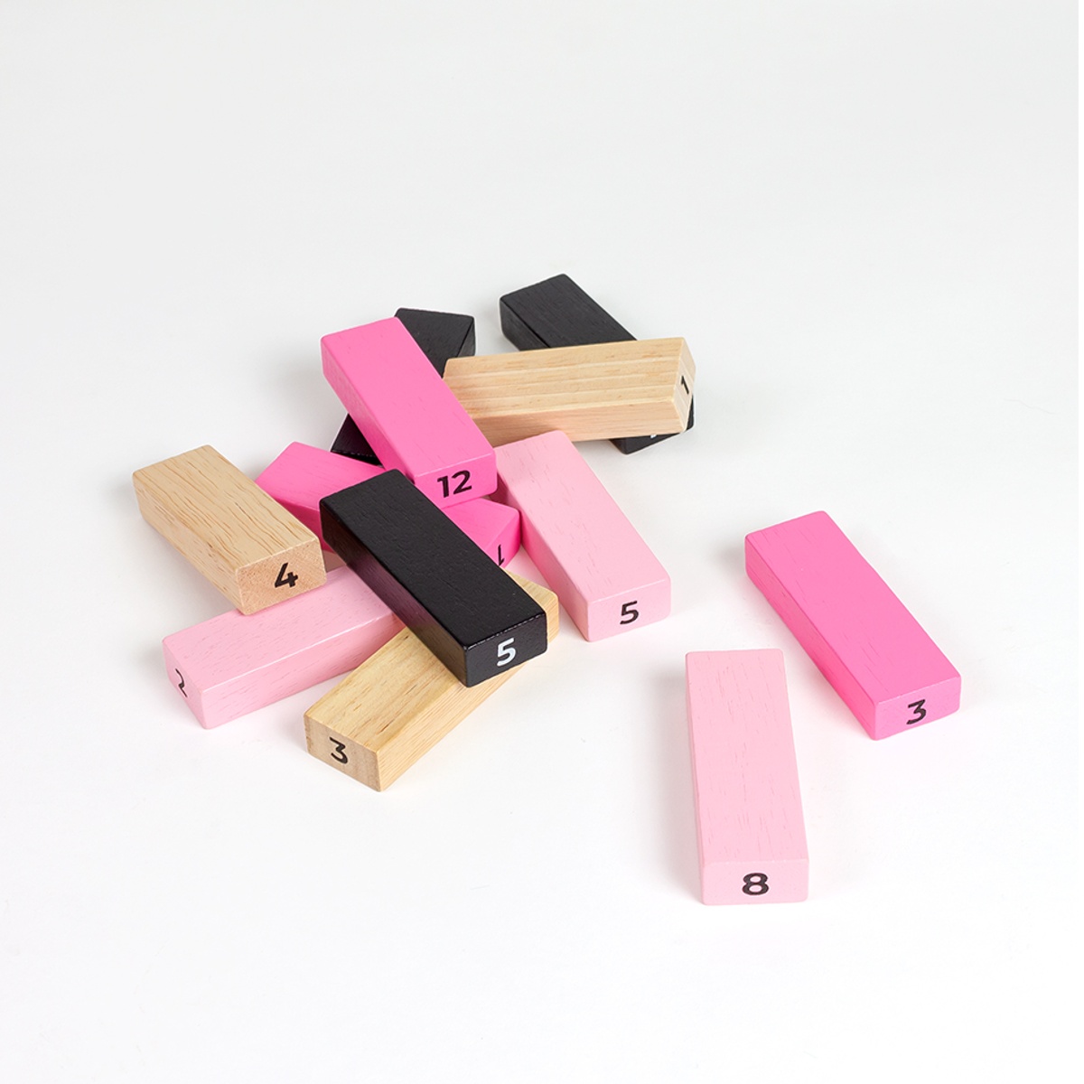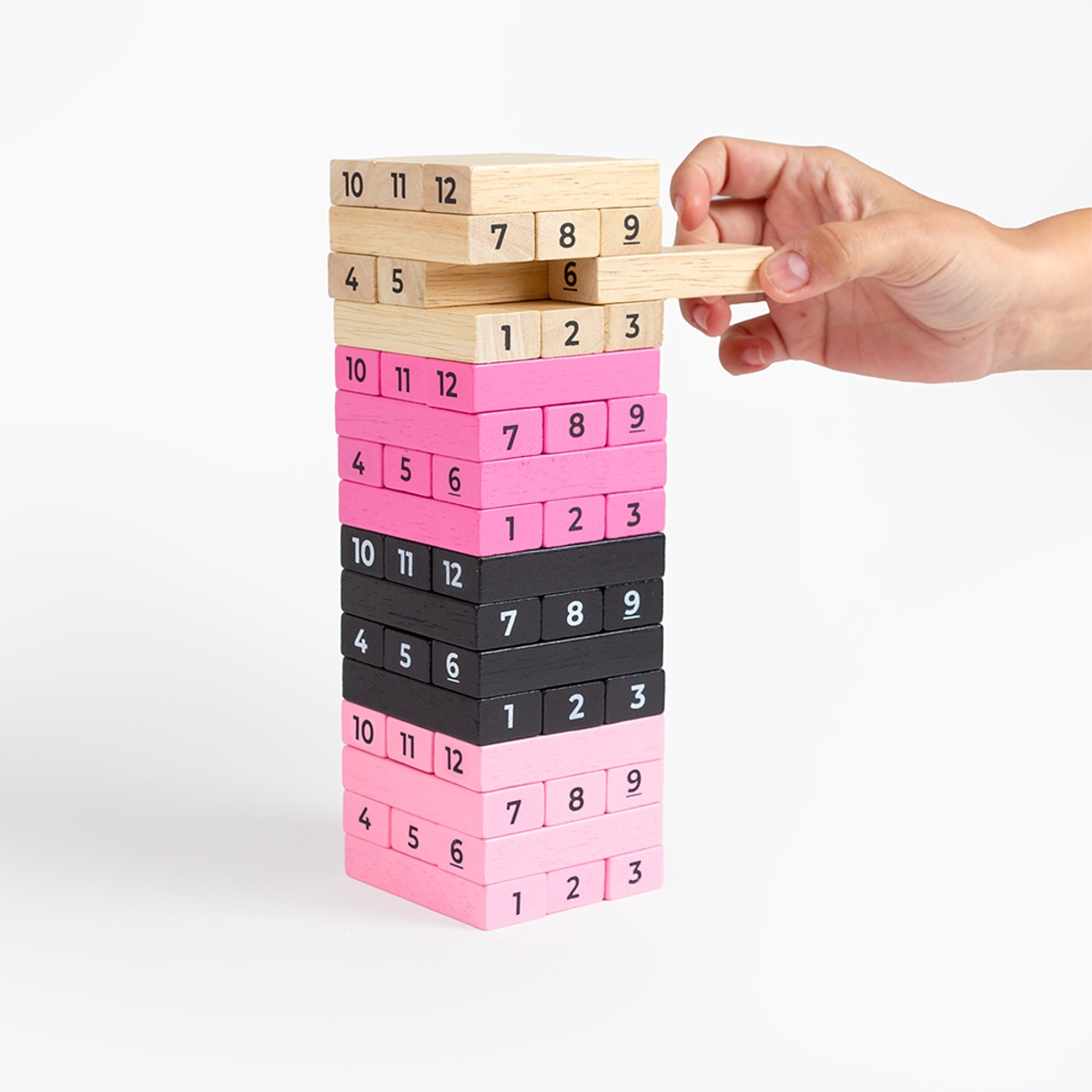 Varianta 2: Pokročilá hra: Sestavte věž podle návodu. Hrajete s barevnou i dvěma číselnými kostkami. První hoďte barevnou kostku, která určí barvu. Následně hoďte dvěma kostkami s čísly, které sečtete a tak získáte dřevěnou destičku, která má být vytažena. Pokud číslo nebo barva uvedená kostkou již není k dispozici, prohráváte svou hru.