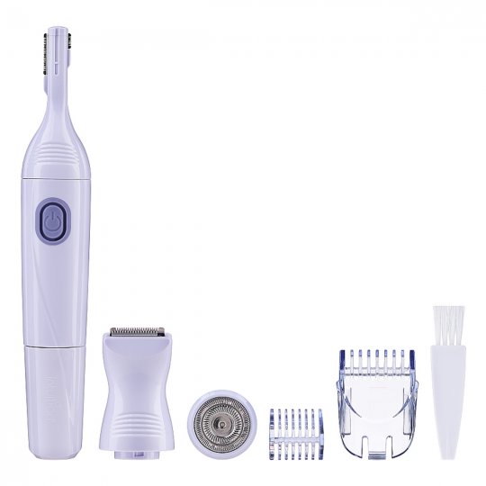 Strojek z odolného plastu má hladké dlouhé tělo ve tvaru válce, které se skvěle drží v ruce a dobře se s ním manipuluje. Jednoduchý systém dovoluje rychle vyměnit nástavec pouhým pootočením. Malý kulatý nástavec s plochou kovovou hlavou je určena pro jemné chloupky na tváři. Díky dvěma kroužkům zabraňuje přímému styku s pokožkou pro hebké oholení bez podráždění. Dlouhý tenký nástavec se dvěma různě velkými břity na každé straně hravě a precizně upraví linie vašeho obočí. Na něj můžete nasadit plastový hřebínek se dvěma velikostmi, kterým určíte délku střihu pro dokonalý styling. Poslední nástavec je určen pro zbytek těla, především pak podpaží a oblast intimních partií. Snadno oholí i delší chloupky a zakřivení břitů se přizpůsobí pokožce. Na tento nástavec můžete nasadit taktéž plastový hřebínek, který má čtyři nastavitelné délky, takže můžete tvarovat své chloupky do různých obrazců a mít jej vždy špičkově upravené.