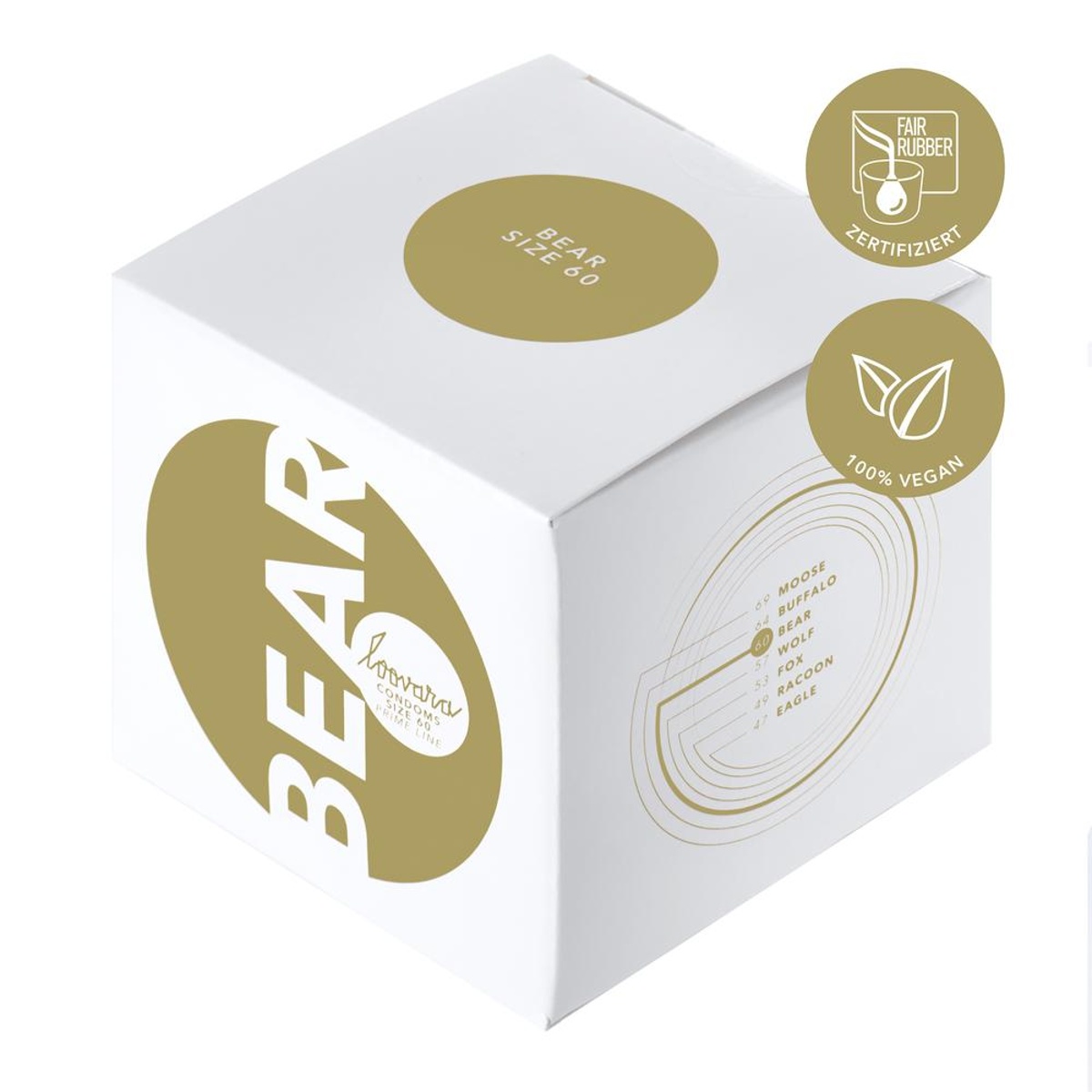 Loovara BEAR 60 mm je už celkem slušný macek. Využijí jej vyvinutější gentlemani. Je ideální pro penis s obvodem 12,1 cm - 13,1 cm. Ten si sami můžete pohodlně změřit v pohodlí domova provázkem nebo proužkem papíru a zvolit takový, který se vám skvěle přizpůsobí. Kondom s rezervoárem je vyroben z přírodního kaučuku prvotřídní kvality, který vyniká svou pružností a mimořádnou pevností. Tím je také zaručena ochrana i při divočejších hrátkách. Stěna prezervativu je tenká, takže nabídne skvělou citlivost a nevyruší vaše hrátky. Při výrobě nebyl použit žádný zvířecí produkt, proto je vhodný i pro příznivce veganského směru. Kondom je lubrikován jemným silikonovým olejem. Samozřejmostí je vysoký hygienický standart a elektronické testování. V balení naleznete 12 jednotlivě zabalených kusů, které vám nějakou dobu vydrží.