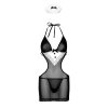 Kostým v černé barvě se sněhově bílými prvky je ušitý z hedvábně jemného tylu, který je příjemný na dotek a nabídne vám pohodlné nošení. V kombinaci s nádhernou krajkou je mimořádně atraktivní. Síťovaný materiál je výjimečně pružný a perfektně se tak přizpůsobí vašim křivkám. Navíc je průsvitný, čímž podpoří magnetickou přitažlivost. Minišaty bez ramínek zavazované za krkem a na zádech tenkým provázkem odhalí šíje pro sladké polibky a žhavé doteky. Nemají kostice ani výplň podprsenky, čímž nabídnou volnost pohybu a dokonalý komfort. Hluboký výstřih se saténovou mašličkou okoření vzhled dekoltu a průstřih na bocích zvýrazní boky. Krajková zástěra a čelenka vytvoří typický design. Minimalistická tanga pak mají příjemnou bavlněnou podšívku v rozkroku.