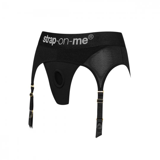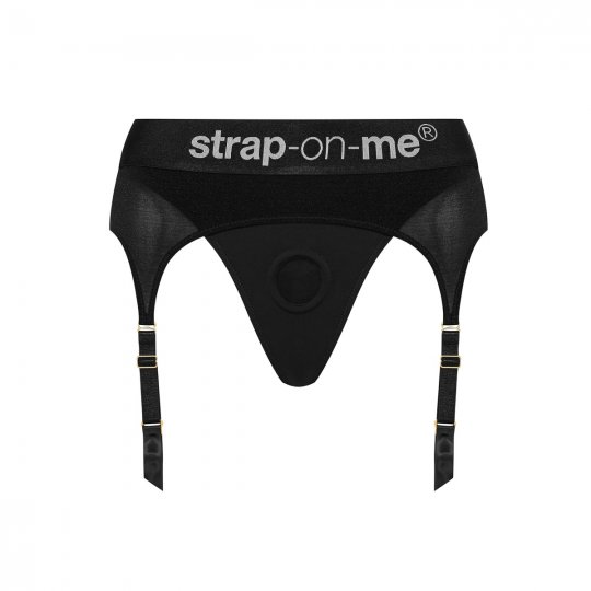 Fascinující postroj moderního a dokonale elegantního designu sexy spodního prádla černé barvy vás na první pohled přesvědčí, že ho doma musíte mít. Je ušitý z hedvábného mikrovlákna prvotřídní kvality, které pohladí vaši pokožku a dopřeje extrémně pohodlné nošení, jako byste na sobě měli druhou kůži. Přes boky a k zadečku se pak spouští jemný průsvitný tyl, který imituje podvazkový pás zdůrazňující ženskost. Široký elastický pás a materiál kalhotek je pružný a perfektně se přizpůsobí vašim křivkám, které ještě vyzdvihne a zvýrazní. Výjimečný styl tang doplní nastavitelné podvazky s klasickými sponami, kterými můžete připnout vaše oblíbené punčochy. V předním panelu je zašitý diskrétní silikonový kroužek s vnitřním průměrem 3,7 cm, který uchytí jakékoliv dildo značky Strap-on-me. Dildo ani punčochy nejsou součástí balení.