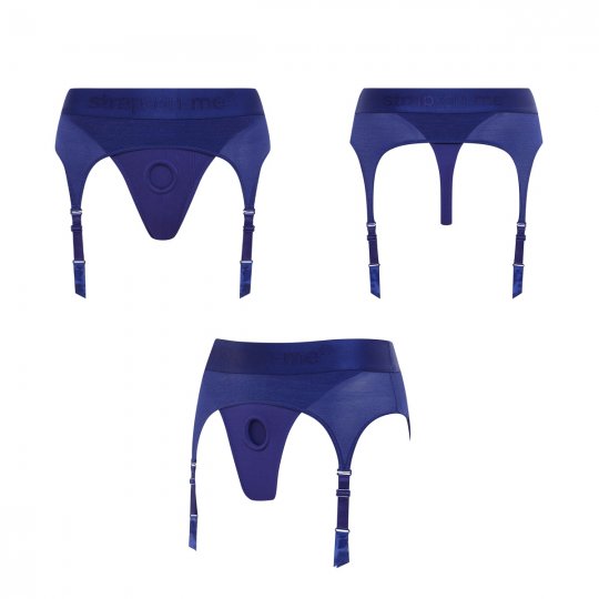 Fascinující postroj moderního a dokonale elegantního designu sexy spodního prádla modré barvy vás na první pohled přesvědčí, že ho doma musíte mít. Je ušitý z hedvábného mikrovlákna prvotřídní kvality, které pohladí vaši pokožku a dopřeje extrémně pohodlné nošení, jako byste na sobě měli druhou kůži. Přes boky a k zadečku se pak spouští jemný průsvitný tyl, který imituje podvazkový pás zdůrazňující ženskost. Široký elastický pás a materiál kalhotek je pružný a perfektně se přizpůsobí vašim křivkám, které ještě vyzdvihne a zvýrazní. Výjimečný styl tang doplní nastavitelné podvazky s klasickými sponami, kterými můžete připnout vaše oblíbené punčochy. V předním panelu je zašitý diskrétní silikonový kroužek s vnitřním průměrem 3,7 cm, který uchytí jakékoliv dildo značky Strap-on-me. Dildo ani punčochy nejsou součástí balení.