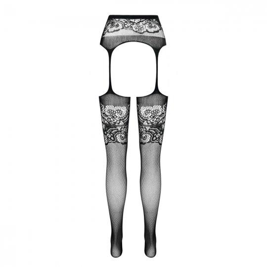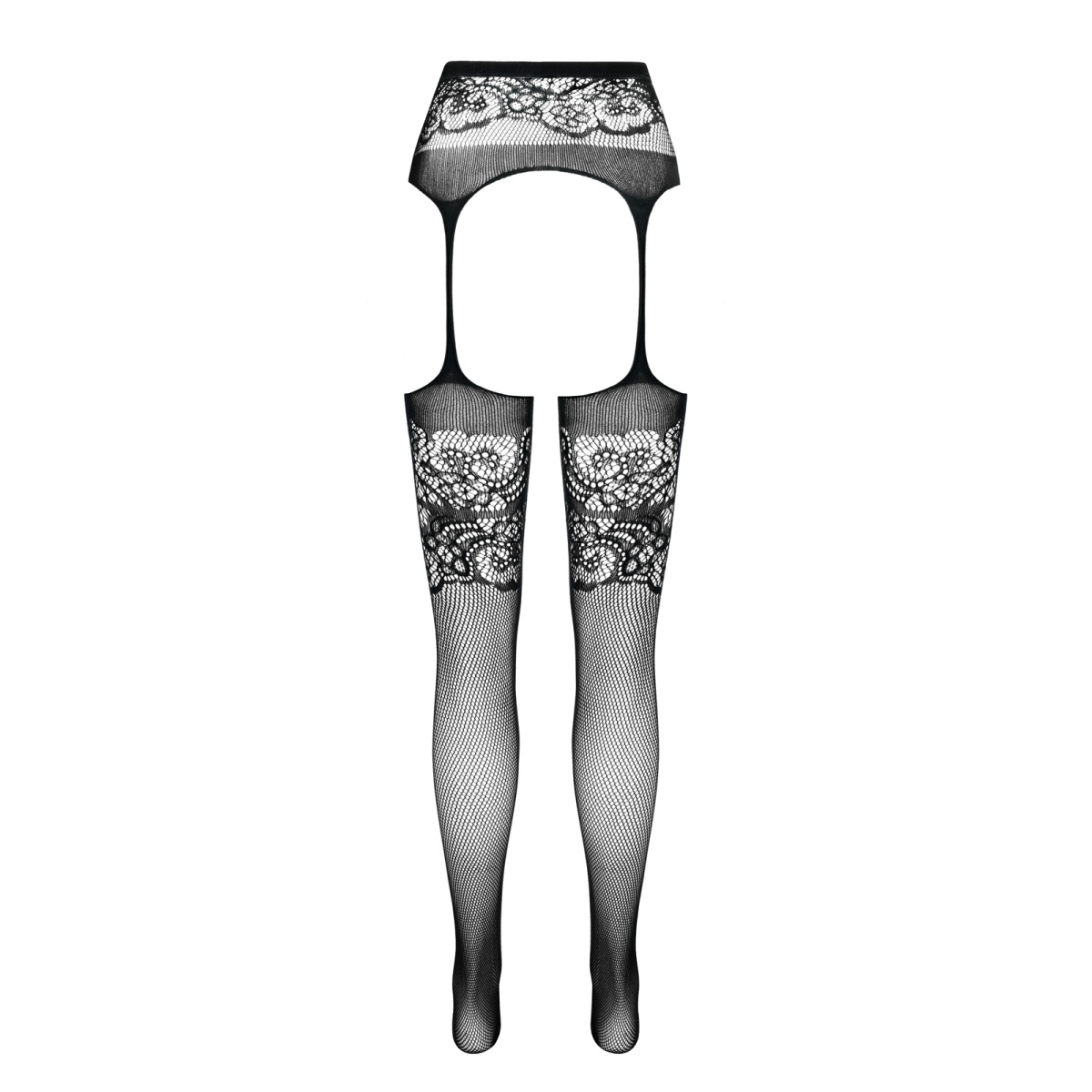 Punčocháče jsou vyrobeny z vysoce odolné síťoviny, která je velmi pružná, díky čemuž se perfektně přizpůsobí potřebám vaší postavy. Materiál obepne boky, zvýrazní je a díky pružnosti se nebude zařezávat. Punčochy jsou k vrchní části připevněny imitací podvazků, takže budou hezky držet na místě a nebudou sklouzávat dolů. Otevřený rozkrok přitáhne pohled na váš zadeček a klín. Elegantní květinový vzor na vrchní části doplňuje široký vzorovaný lem na punčochách, který sahá téměř až ke kolenům.