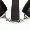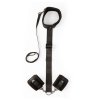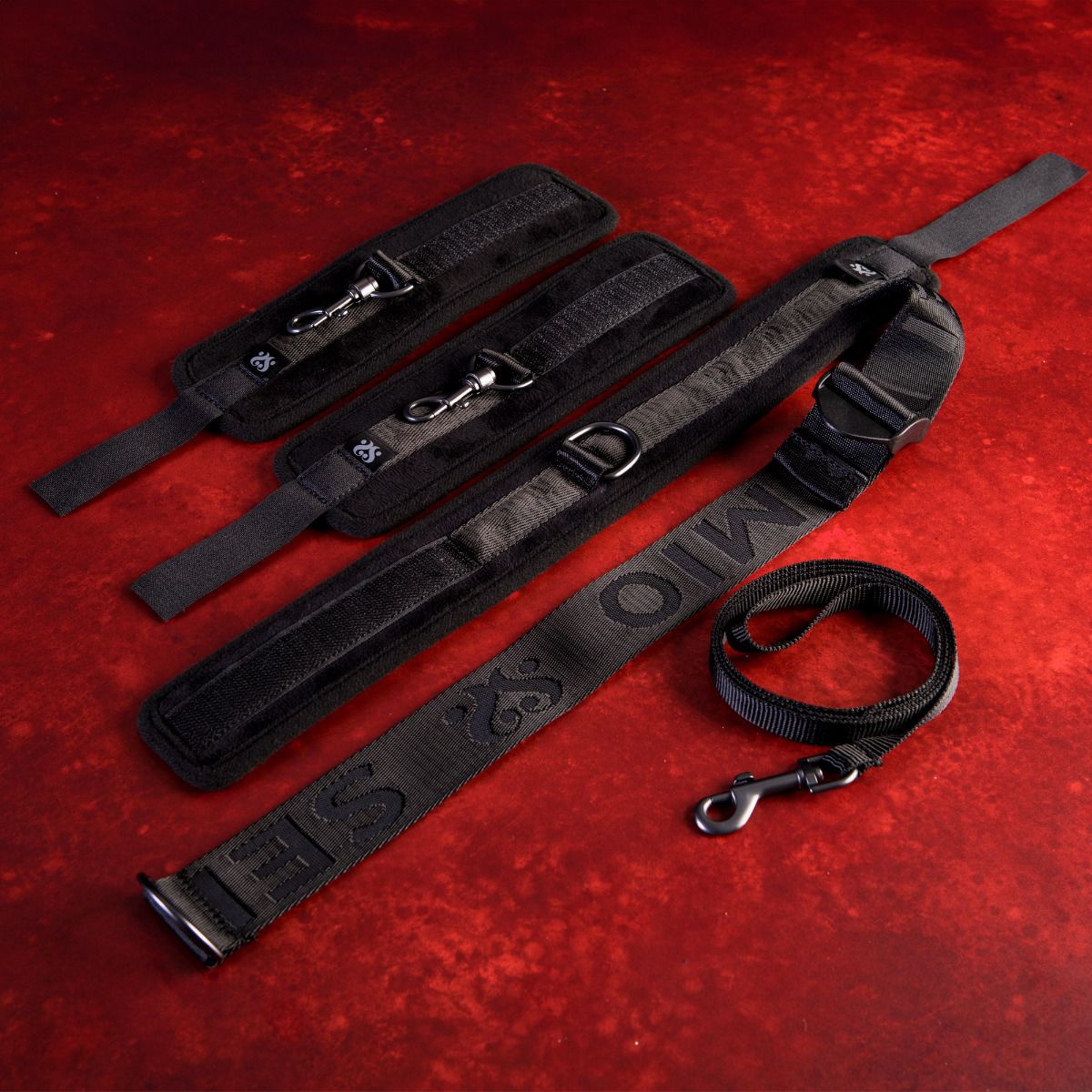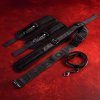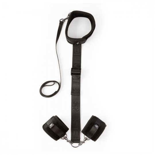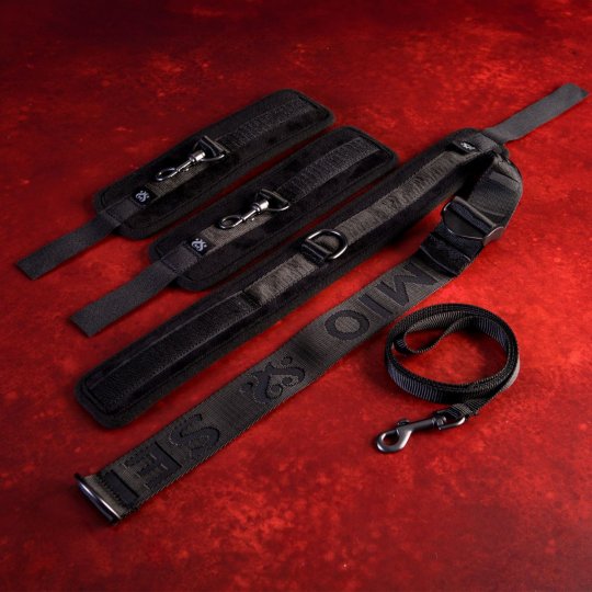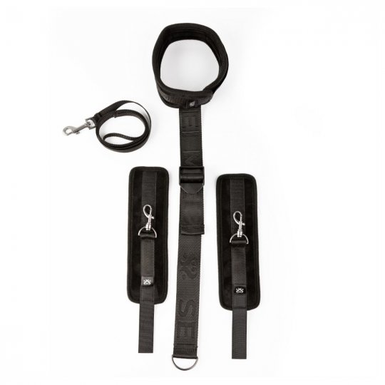 Tato sada v elegantním designu sexy černé barvy odráží i ten nejpečlivější smysl pro detail v kombinaci se špičkovou italskou kvalitou. Obsahuje příjemný obojek a měkké polstrované manžety na zápěstí, které jsou vyrobeny z extrémně jemného semišového plyše, jež zaručí dokonalý dotek něhy a tedy maximální pohodlí při nošení. K obojku je integrovaně připojen vysoce odolný a pevný popruh z prvotřídního nylonu, který je díky plastovému jezdci nastavitelný pro jakoukoliv postavu. Zakončen je D kroužkem na který pomocí klasických karabin napojíte pouta na ruce. Pouta i obojek se zapínají na suchý zip, čímž docílíte nejen naprosto přesného uchycení dle potřeby, ale také zaručíte bezpečné a rychlé osvobození. Tenké nylonové vodítko disponuje poutkem proti vytržení z ruky a karabinou pro připojení k obojku. Materiály pak neobsahují ftaláty ani nikl, aby se eliminovalo riziko alergických reakcí.