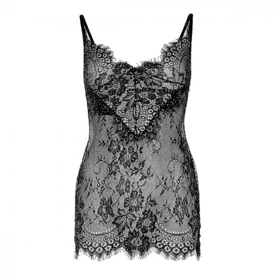 Udělejte si doma romantický večer jen ve dvou s dobrou večeří, filmem a následnými postelovými radovánkami. Máme tady pro vás speciální erotický kousek přesně pro tuto příležitost. Extra krátké šaty Backless od značky Leg Avenue v elegantní černé barvě jsou ušity z jemné krajky s květinovým vzorem. Jsou lehce průhledné, takže nechají nahlédnout "pod pokličku". Po celých šatech jsou rozesety třpytivé kamínky, takže vypadají jako hvězdná obloha. Podprsenka je naznačena švy, ale nemá vyztužené košíčky ani kostice. Spodní vlnkovaný lem a oblast výstřihu zdobí krátké třásně a dodávají tak šatům krásný detail. Hluboký výstřih na zádech jistí šňůrka, aby šaty držely správný tvar. Šaty nejsou moc pružné a jsou spíše menší, proto doporučujeme je pořídit o číslo větší, než obvykle nosíte. Součástí jsou také minimalistická tanga, která vepředu zakrývají jen to nejnutnější a vzadu přechází v jedinou šňůrku, čímž nechávají vyniknout váš zadeček.