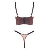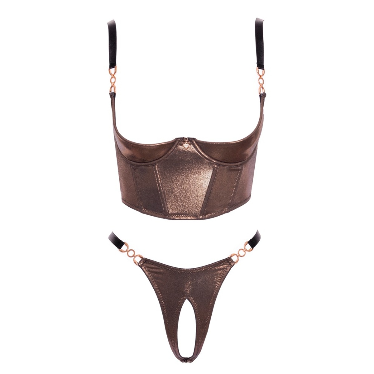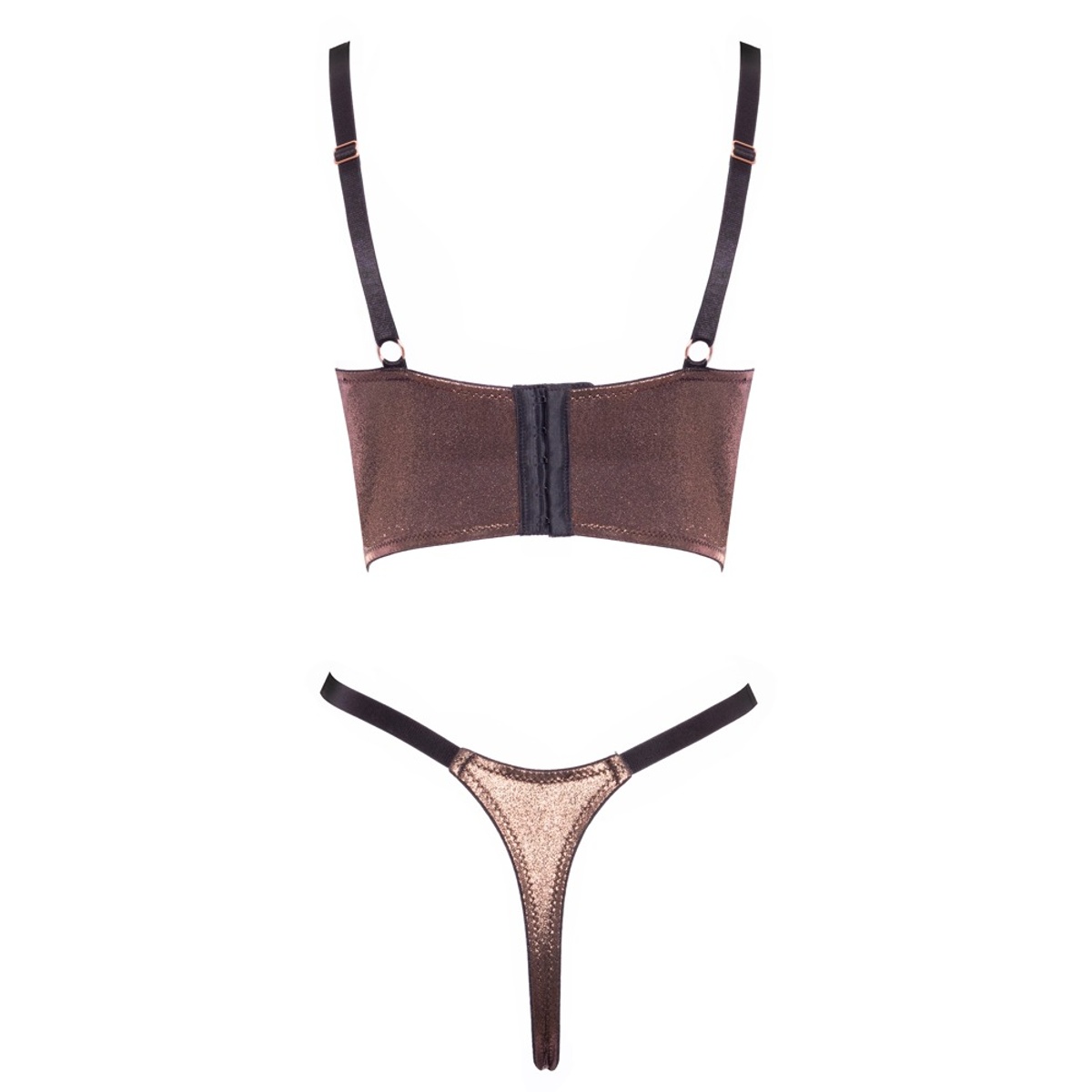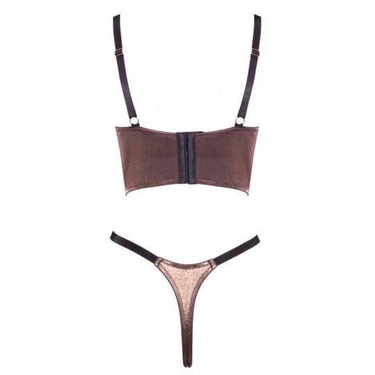 Souprava v exkluzivním třpytivém designu bronzově zlaté barvy je vyrobena z elastické hladké tkaniny, která se příjemně přizpůsobí tělu a nechává vyniknout jeho ladné linie. Podprsenka s push-up kosticemi a poloviční výplní opticky pozvedá ňadra a vytváří dokonale svůdný tvar vašeho dekoltu. Nastavitelná ramínka a široký styl v korzetovém duchu přidávají na atraktivitě i stabilitě, zatímco zlaté kovové spony dodávají lesk a dotek luxusu. Tanga s otevřeným rozkrokem zaujmou kombinací jemného materiálu a smyslného střihu, který přirozeně zvýrazní zadeček a nabízí možnost spontánní akce bez svlékání.