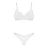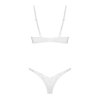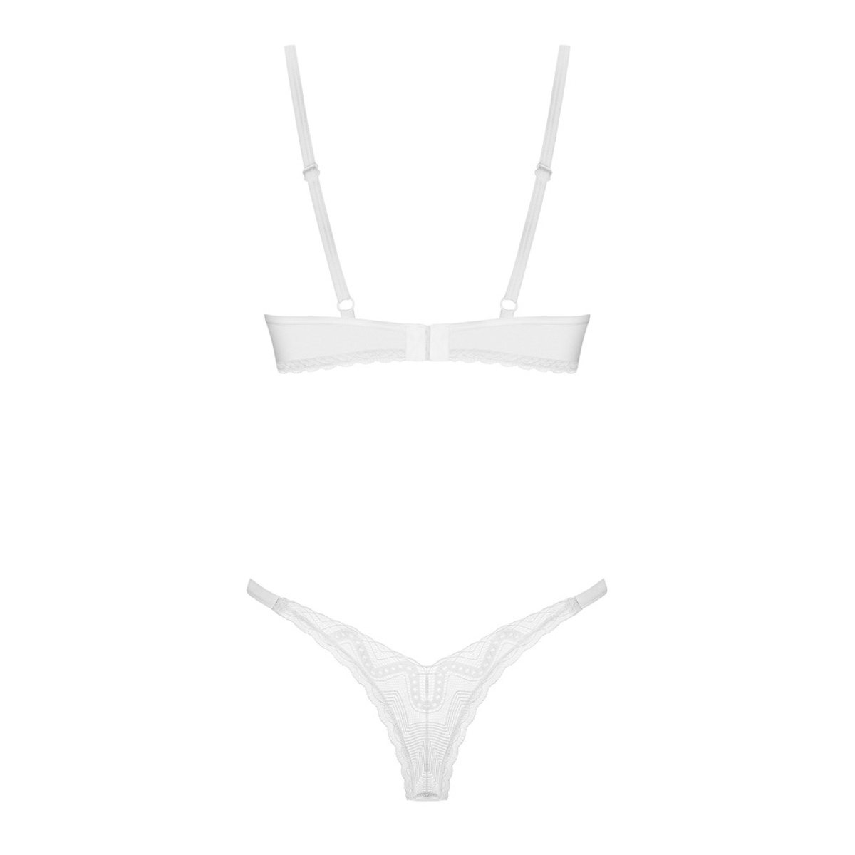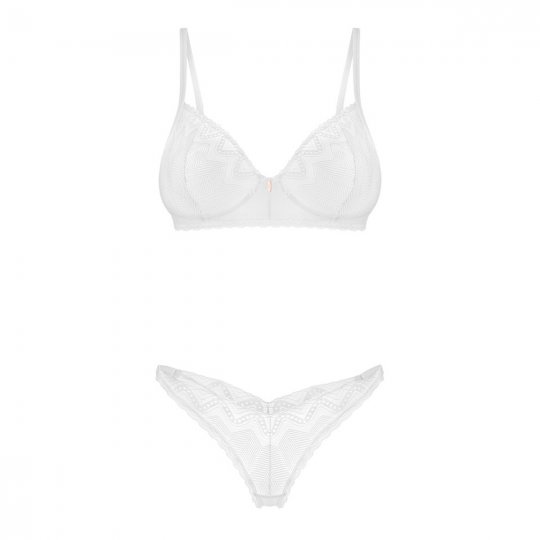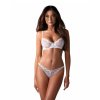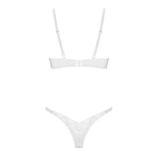Výjimečná sexy souprava v elegantním designu sněhově bílé barvy znásobí váš potenciál. Je ušita z hedvábně jemné krajky s půvabnými geometrickými vzory, která pohladí vaši pokožku s neuvěřitelnou něžností a dopřeje vám výjimečné pohodlí při nošení. Je lehce průsvitná a zajistí tak vaši svůdnost. Vysoce kvalitní zpracování nabídne odolný a pevný materiál, který se díky své pružnosti skvěle přizpůsobí vaší postavě. Podprsenka s kosticemi bez výplně dokonale podpoří vzhled a tvar vašich ňader. Navíc je ozdobena třpytivým šperkem a zapíná se vzadu na zádech klasickou řadou háčků. Luxusní tanga moderního střihu zvýrazní křivky vašich boků i zadečku, který v nich bude doslova k nakousnutí. Pro váš maximální komfort mají v rozkroku bavlněnou podšívku.