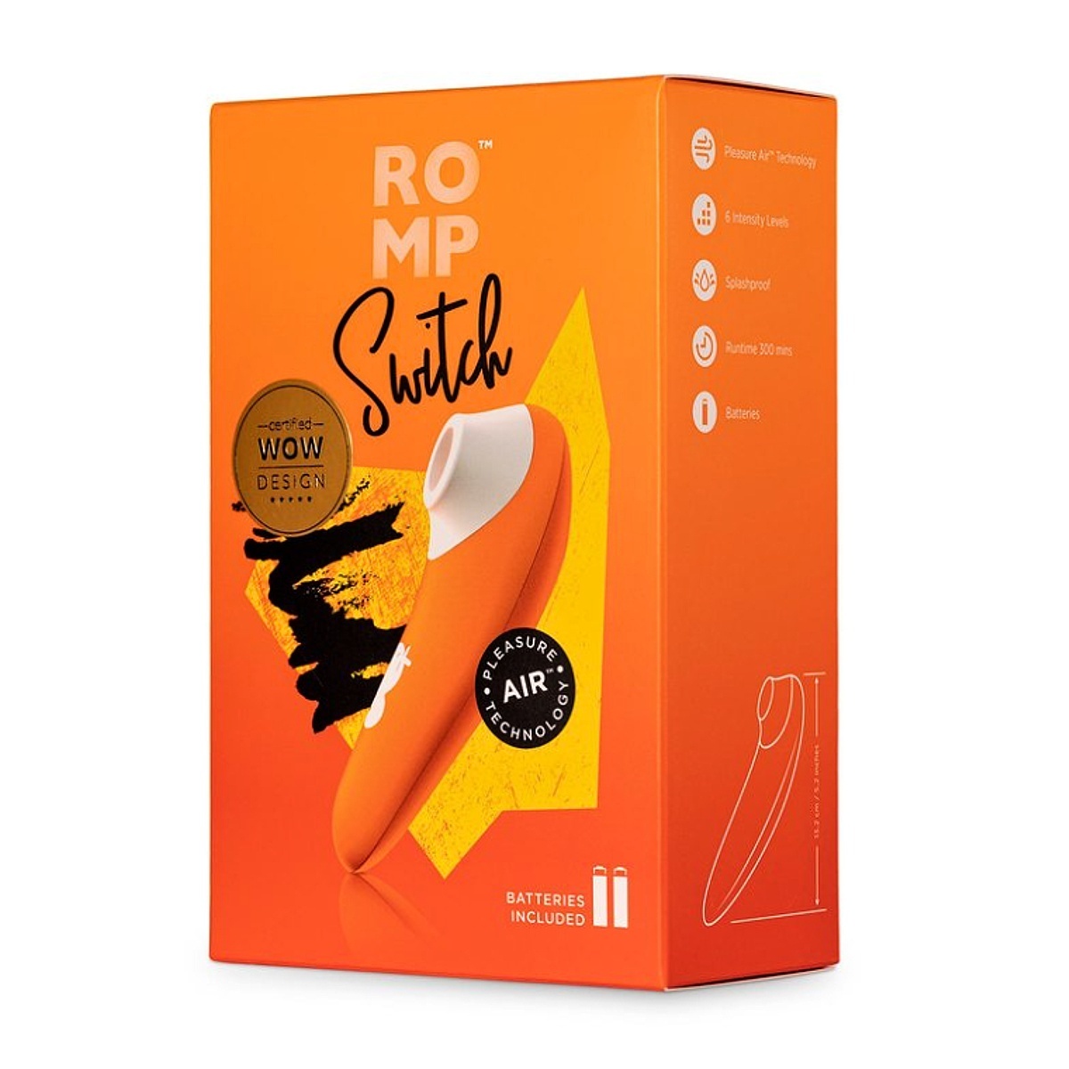 Dámy, připravte se na neodolatelnou jízdu svého života ať už jste kdekoliv. Pokud se chystáte vyrazit mimo domov a nechcete se vzdát svých slastných intimních chvilek, pak bude tento stimulátor klitorisu ROMP SWITCH Clitoral Stimulator v rozkošné oranžové barvě ideální volbou. Jeho velikost je vhodná pro cestování. Ovšem i v ložnici si jej vychutnáte plnými doušky. Nejen, že bude vaše vyvrcholení neuvěřitelně rychlé, ale především neodolatelně intenzivní. Je pravděpodobné, že si fenomenální orgasmus užijete i několikrát za sebou. Stimulátor v decentním designu je vyroben z odolného matného ABS plastu s hubičkou z ultra jemného a sametově hebkého lékařského silikonu, který je zdravotně nezávadný a tudíž vhodný i pro citlivou pokožku. Perfektně se drží v ruce a dobře se s ním manipuluje. Hubička oválného tvaru skvěle padne téměř všem. Jeho patentovaná technologie Pleasure Air™ vás překvapí svými pulzacemi, které zapříčiní nečekaný ohňostroj ve vašem klíně. Unikátní bezkontaktní stimulace klitorisu prostřednictvím tlakových vln vám otevře třináctou komnatu dosud nepoznané rozkoše. Díky této technologii poskytuje úžasnou bezdotykovou stimulaci klitorisu. Tlakové vlny vytvářejí vibrace, které nezpůsobují ztrátu citlivosti. Hubička obklopuje oblast klitorisu bez přímého dotyku což je metoda, kterou miliony spokojených uživatelek po celém světě hodnotí jako velmi rychlý a téměř zaručený způsob dosažení intenzivního orgasmu. Ke všemu je stimulátor výkonný a tichý. Na výběr máte 6 intenzit síly pulzací, abyste si našla ten nejvhodnější přesně podle vašich preferencí. Jeho služby si můžete vychutnat také ve sprše, protože je odolný proti stříkající vodě nabíjení se nemusíte obávat. Díky dvěma snadno vyměnitelným AAA bateriím s ním můžete počítat třeba i ve stanu. Ty jsou součástí balení, abyste mohla ihned začít.