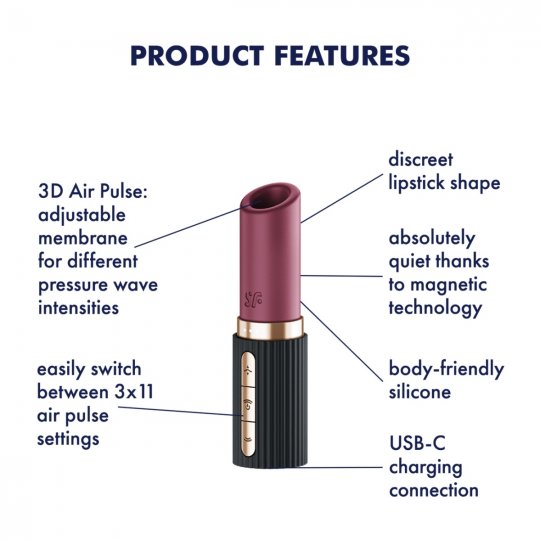 Moderní stimulátor v neuvěřitelně elegantním designu rtěnky tajemně černé barvy vás uchvátí na první pohled. Je vyroben z jemného lékařského silikonu, který pohladí vaše partie s naprostou něžností a je zcela nezávadný pro lidskou pokožku. Obal je vroubkovaný a doplněný o prvky z odolného ABS plastu v barvě růžového zlata, který mu dodává punc luxusu. Pod hygienickým víčkem, které jej udrží v čistotě a bezpečí se nachází krátká vínově červená tyčinka s měkkou zkosenou špičkou, která perfektně vyhledá svůj cíl a zaměří svou pozornost pouze na nejcitlivější erotogenní zónu ženy. Skvěle se drží v ruce a dopřeje pohodlnou a přesnou manipulaci. Na těle pak naleznete 3 snadno dostupná tlačítka a pod víčkem 3 skryté LED diody, které vám ukazují sílu vašeho prožitku.