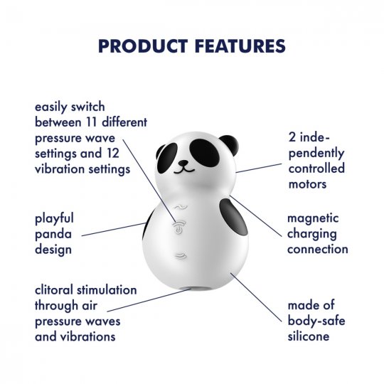 Nenapodobitelně hravý moderní design medvídka pandy v černo bílé barvě zaručí, že se do něj zamilujete na první pohled. Díky tomuto diskrétnímu vzhledu si jej bez obav můžete vzít v kabelce kamkoliv s sebou a bude se také perfektně vyjímat na nočním stolku. Má pevné zakulacené tělo z odolného ABS plastu, které je pokryto jemným a měkkým silikonem prvotřídní lékařské kvality, jež pohladí vaše partie s něžností a je nezávadný pro lidskou pokožku. Má kulatou hlavu s oušky a ve spodní části tělíčka naleznete měkkou hubičkou, která snadno nalezne svůj cíl. Dobře se drží v ruce a pohodlně se s ním manipuluje. Na bříšku pak naleznete tři snadno dostupná ovládací tlačítka a na zádech dva kovové piny pro magnetické nabíjení.