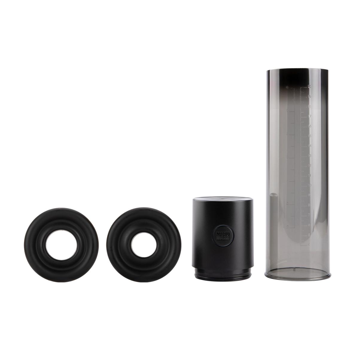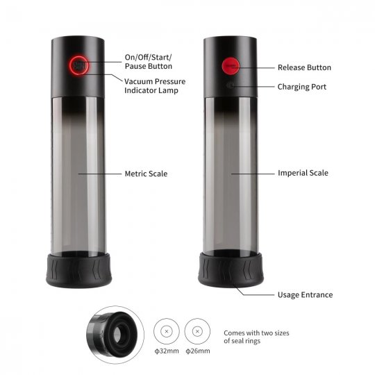 Vakuová pumpa moderního designu černé barvy je složena z pevného válce z odolného ABS plastu, který je průhledný a dopřeje tak sledování vašich pokroků. Dobře se drží v ruce a pohodlně se s ní manipuluje. Dvě manžety z hedvábně jemného silikonu prvotřídní kvality jsou flexibilní a perfektně se přizpůsobí. Najdete tak průměr, který je pohodlný a špičkově utěsní prostor kolem penisu. Na ovládací části naleznete jedno ovládací tlačítko a tlačítko bezpečnostního ventilu pro rychlé vypuštění podtlaku.