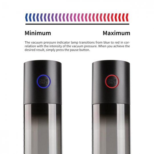 Vysoce výkonný motor vytvoří uvnitř válce silný podtlak, který dokonale potěší váš penis. Sání vzduchu rychle přivede do topořivých tělísek penisu větší množství krve, čímž zvětší objem i délku penisu a erekce se stane pevnější a vydrží déle. Sílu podtlaku si navíc regulujete sami, takže záleží jen na vaší preferenci. Barevný LED indikátor kolem tlačítka vám ukáže aktuální nastavení podtlaku. Slabý podtlak je označen modrou barvou, čím větší podtlak je, tím více se barva mění na červenou. Pravidelným používáním předchází potížemi s erektilní dysfunkcí díky zlepšenému průtoku krve a cíleně tak napomáhá zvýšit sexuální výkonnost a oddálit ejakulaci.