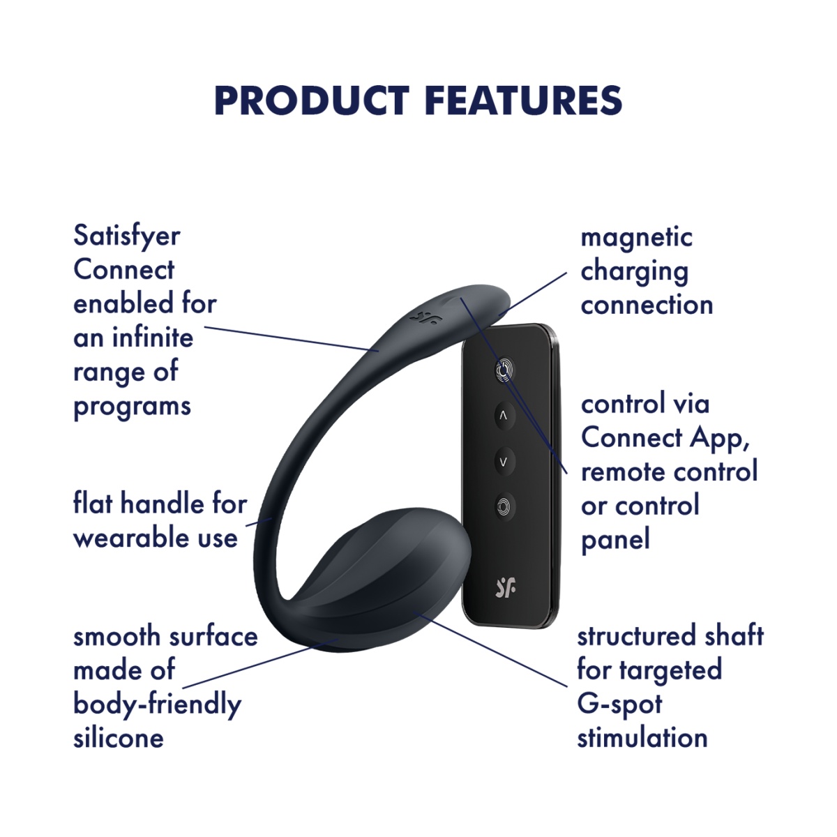 Pro použití s mobilní aplikací Satisfyer Connect si ji zdarma stáhněte do telefonu. Po instalaci získáte nabídku vytvořených režimů či live control, ovládání hlasem i hudbou a po vytvoření free účtu můžete stahovat vytvořené režimy jinými uživateli a propojovat se s nimi či s partnerem přes telefon. Bluetooth spustíte podržením tlačítka power