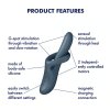 Tento vibrátor v moderním designu modré barvy je vyroben ze sametově jemného silikonu prvotřídní lékařské kvality, který pohladí vaše partie s maximální něžností a je zcela nezávadný pro lidskou pokožku. Má smyslné hladké linie rovného těla, které disponuje úzkou špičkou usnadňující penetraci. Rameno obepíná unikátní měkký kroužek, který dráždí klitoris i stydké pysky, čímž zasáhne větší plochu pro dechberoucí osobní potěšení. Rukojeť se dobře drží v ruce, takže nabídne pohodlnou manipulaci a ukrývá tři snadno dostupná ovládací tlačítka. Na spodní straně má pak dva kovové piny pro magnetické nabíjení.