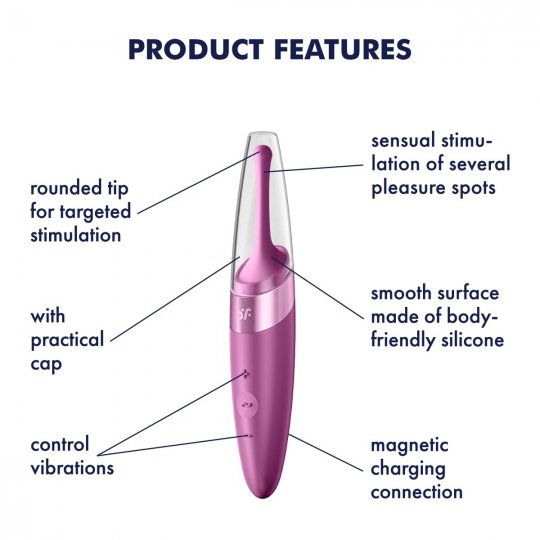 Vychutnejte si dráždění vašich erotogenních zón plnými doušky a podpořte své intimní touhy. Posuňte hranice svých prožitků s tímto fenomenálním vibrátorem SATISFYER TWIRLING DELIGHT se kterým objevíte nové a nepoznané. Tento povedený designový kousek v rozkošné fialové barvě je dokonalý společník pro všechny, kteří milují nejen bodovou stimulaci.