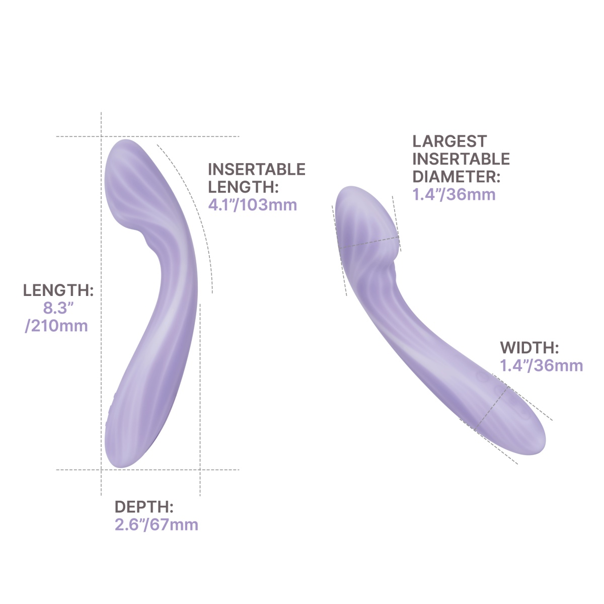 Tento vibrátor v nádherném fialovém designu je vyroben z prémiového dvouvrstvého silikonu prvotřídní kvality, který je na dotek neobyčejně jemný a sametově hladký. Jeho moderní tvar se perfektně přizpůsobí vaší anatomii a flexibilní ergonomicky zahnutá špička přesně zacílí na bod G. Decentní linie těla působí esteticky a navíc něžně stimulují každým pohybem. Vibrátor se skvěle drží v ruce a dopřeje pohodlnou manipulaci. Na rukojeti pak naleznete tři snadno dostupná tlačítka.